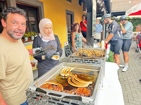 Die erste Etappe führte uns in einer geschlossenen Gruppe nach Gissigheim. Dank Rolands vorausschauender Planung und Vorbestellung erwartete uns dort eine willkommene Stärkung in Form leckerer Teilchen. Hier verabschiedeten sich bereits die ersten Mitstreiter, die von Osterburken aus die Heimreise mit dem Zug antraten.